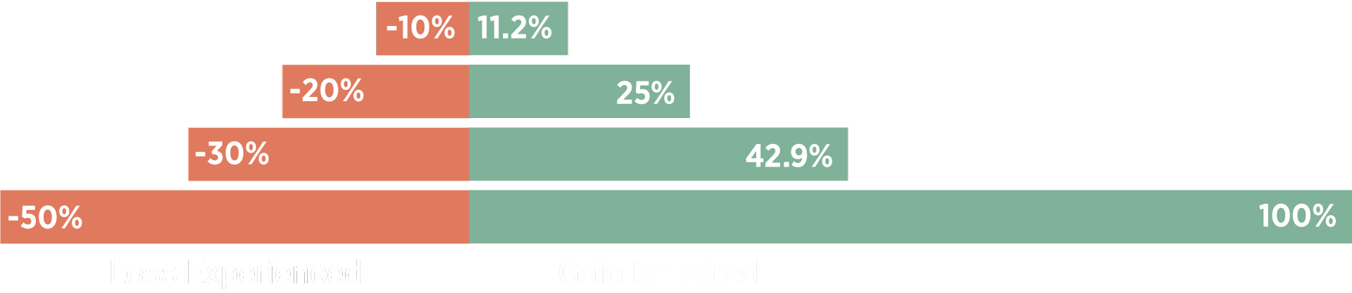 Please Note: Needed % gain to restore loss = [1 / (1 – % Loss)] – 1 For example, the needed gain to restore a 10% loss can be expressed as: [1 / (1 – .10)] – 1 = .1111 or 11.11% Thus, the needed gain to restore the 10% loss is 11.11%. As the loss gets bigger, the needed gain to restore the loss increases at an increasing rate.